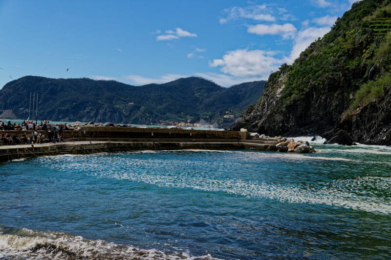 Entre ce village et MANAROLA le trajet se fait facilement un aménagement avec bancs et protections pour se reposer et contempler la Méditerranée (ce jour là, la houle était puissante).